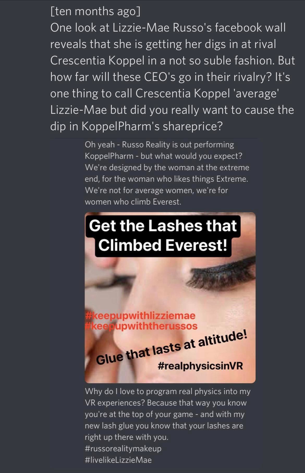 And then her mother, in a show of magnaminity let her settle out of court to separate Lizzie-Mae’s makeup and skincare lines from the rest of the Keeping Up With The Russo’s merchandising.