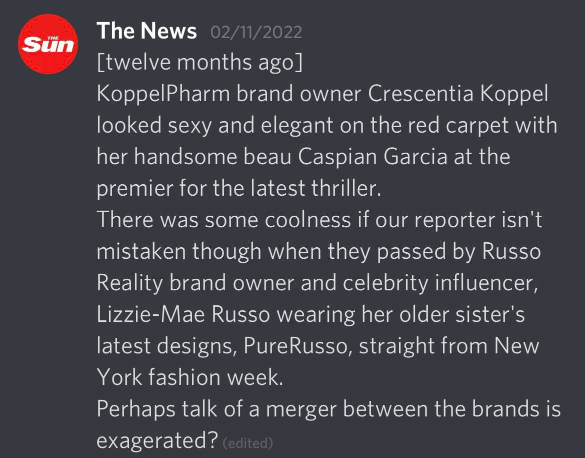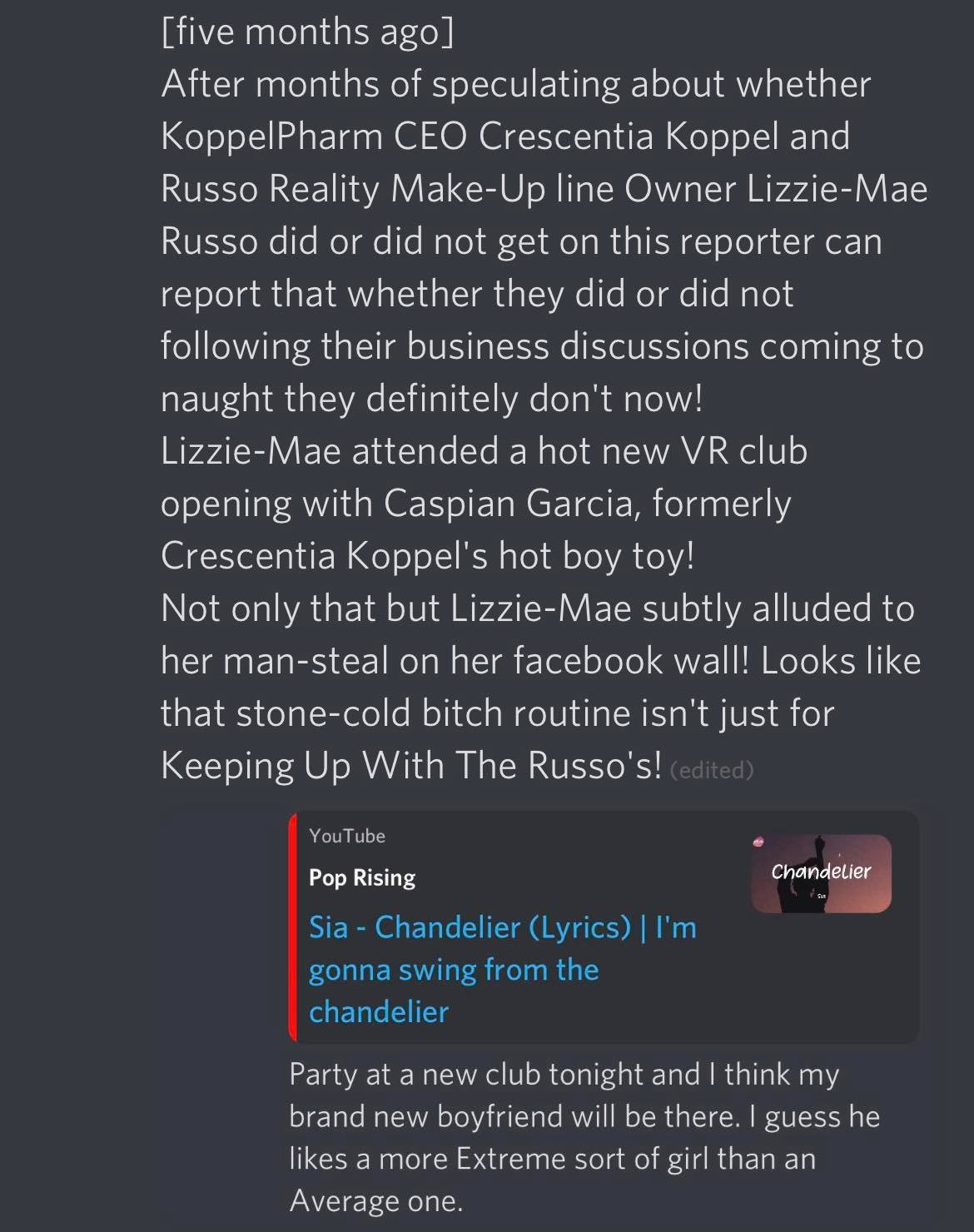 Oh I should mention, in addition to running my character I was also using my other Discord log-in in the browser to run The News – so that I could put some scandals out there about Lizzie-Mae and also offered my services to other players.